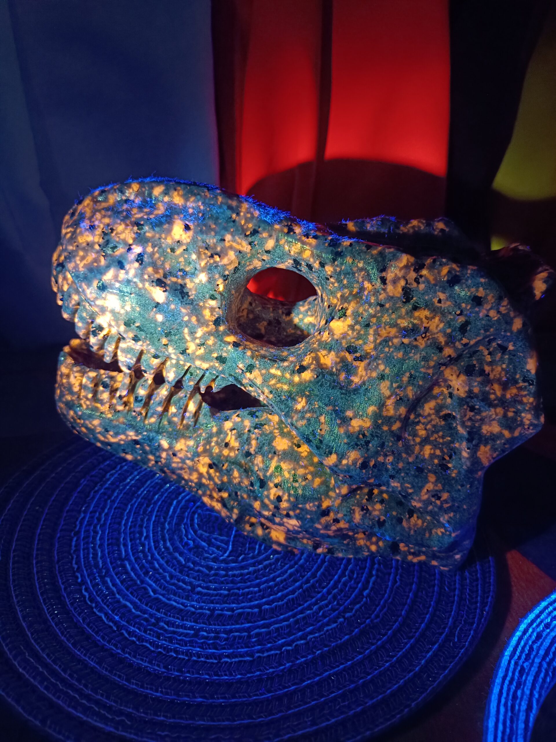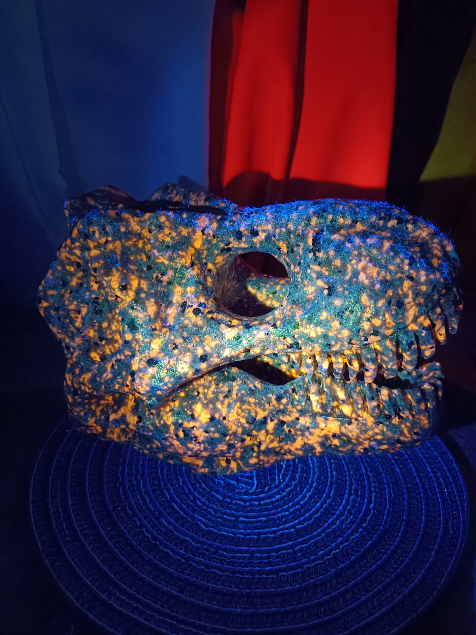 When exposed to ultraviolet radiation, the internal electrons are excited and jump, releasing visible light.